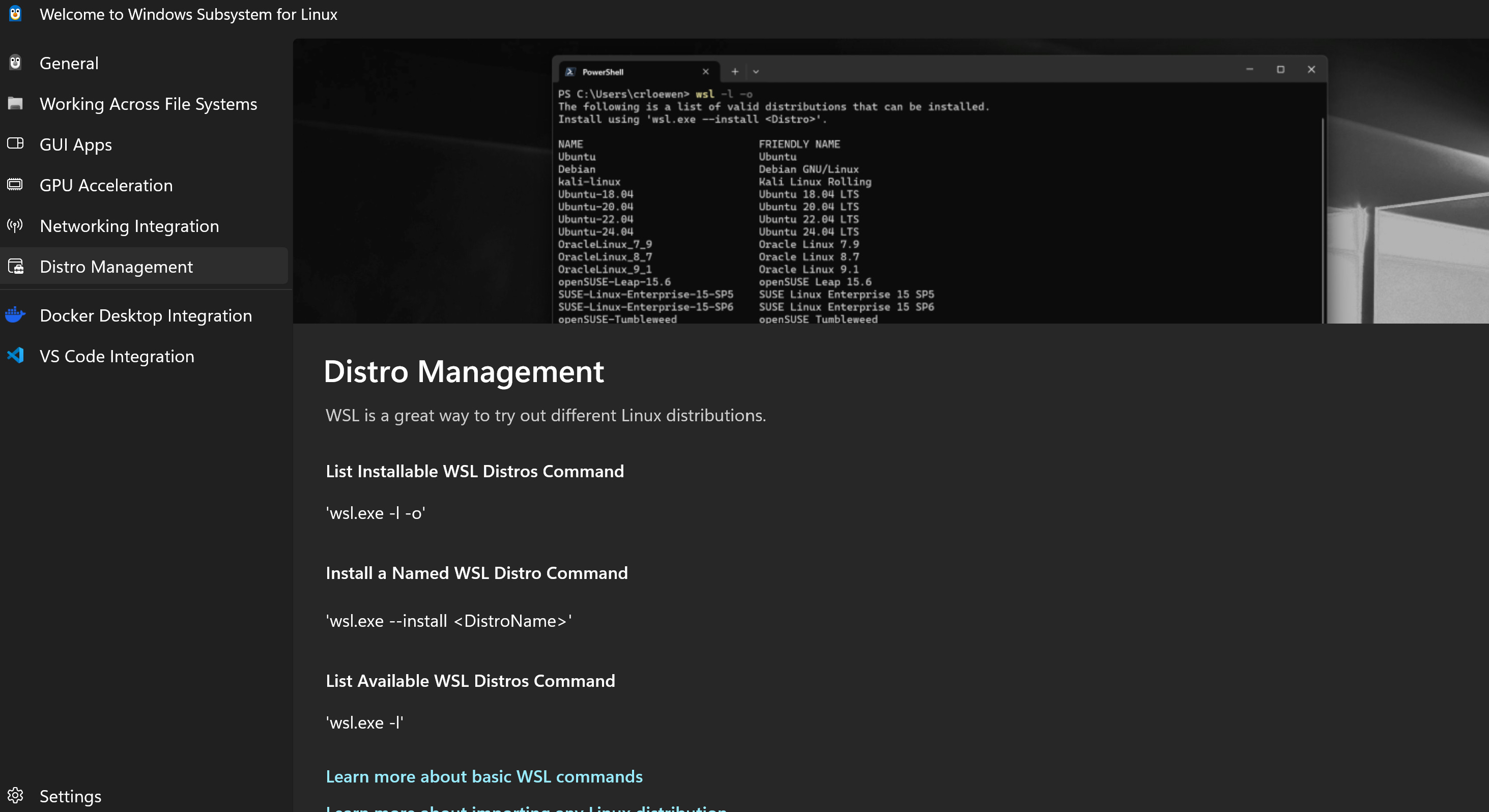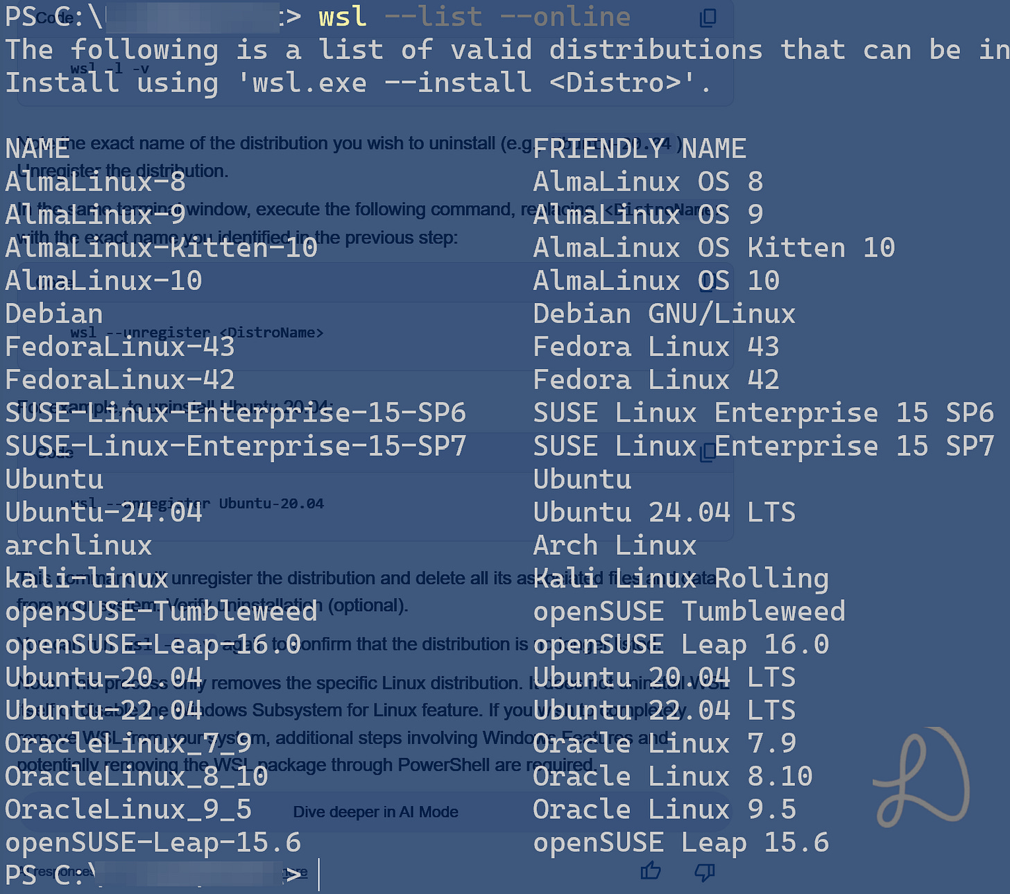 We can get the latest list with wsl —list —online. The list may have expanded since the last I checked. In addition to Debian and Ubuntu, there is Fedora and Arch Linux (CachyOS) as well.