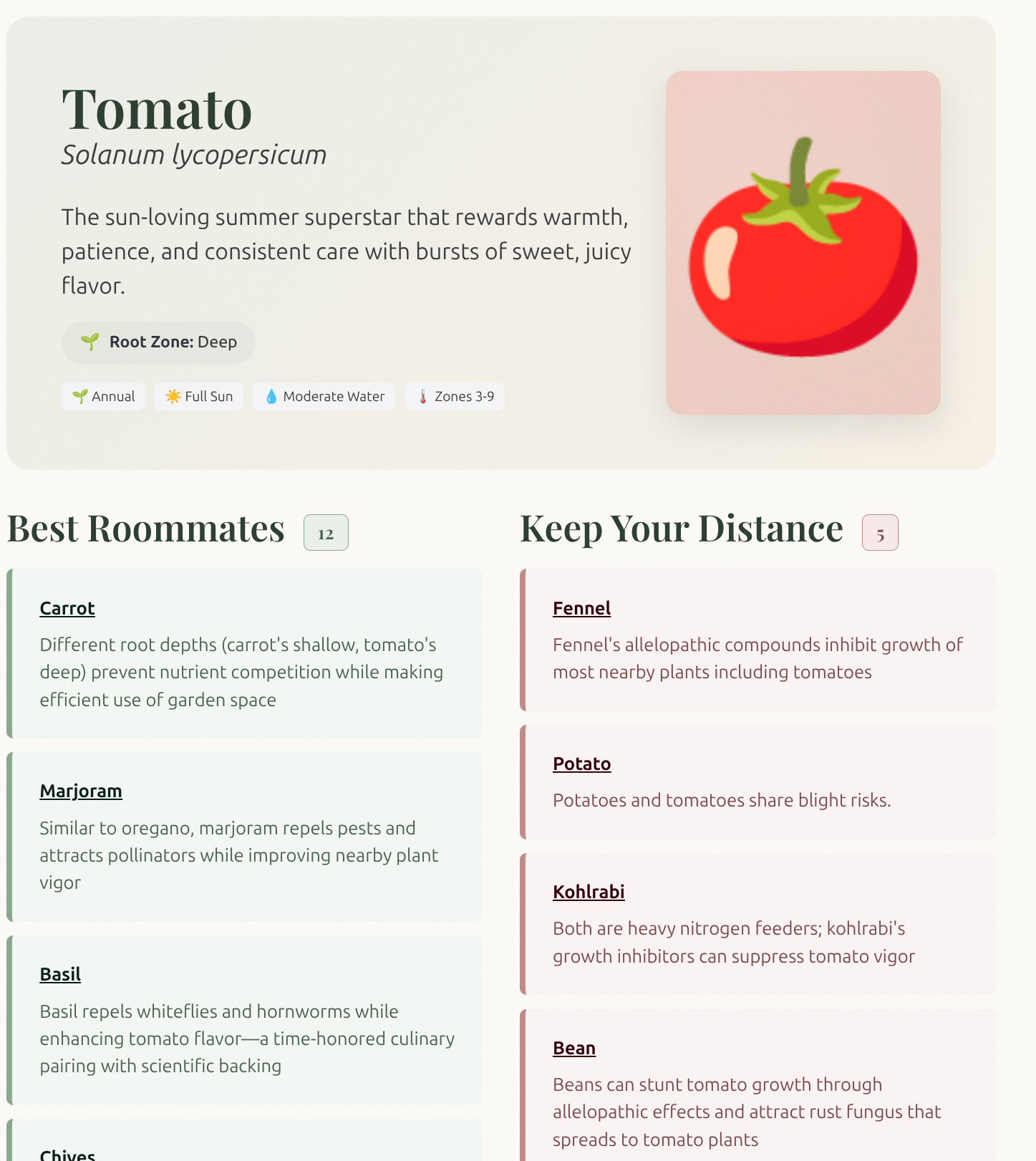 Root depth means no competition. Tomatoes are deep-rooted; basil is shallow. They occupy completely different soil layers. This is one reason the pairing works well — you’re not robbing Peter to pay Paul.