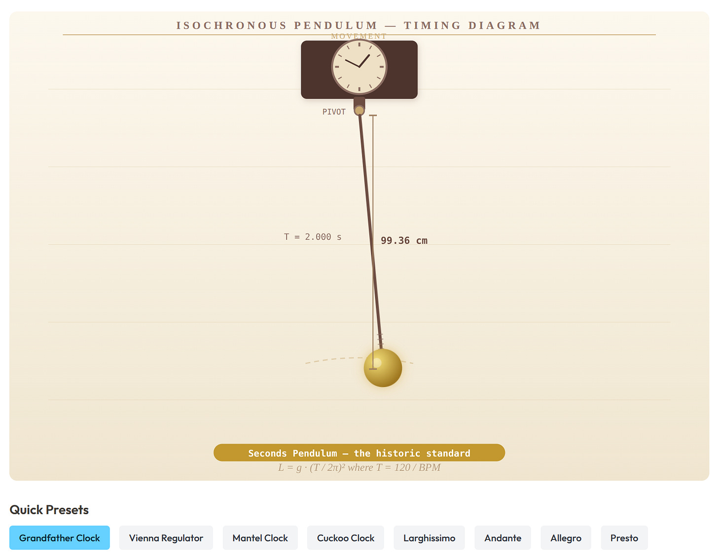 What has changed is that you can now enter your target BPM and your local gravity constant and get the exact pivot-to-bob distance for your pendulum in under a second — without a cathedral lamp, a heartbeat, or a ship to South America.
