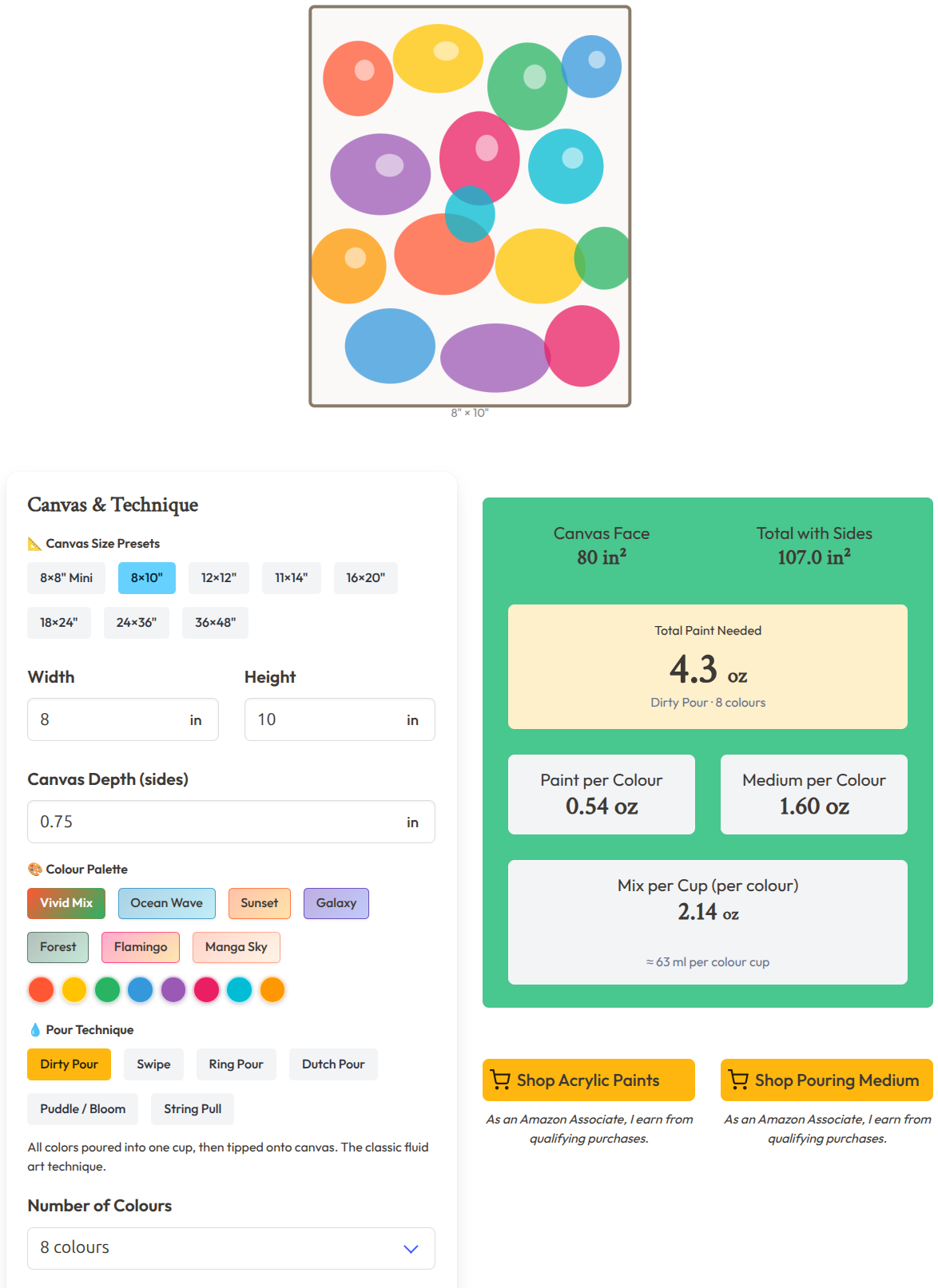 The calculator outputs total mixed volume, per-colour cup volumes, and medium volume per cup. You mix to those numbers before you open a single paint bottle. No more mid-pour scrambling.