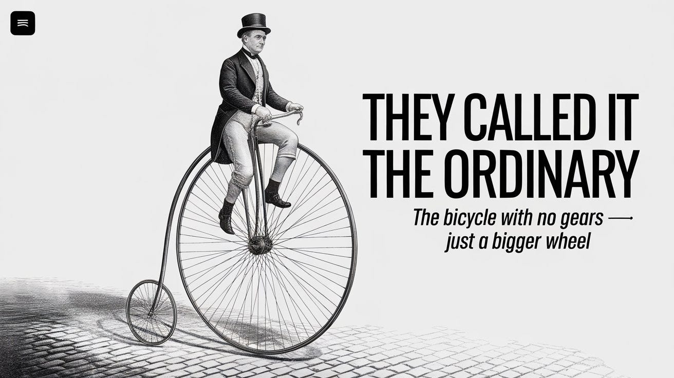 The Ordinary was the fastest human-powered land vehicle of the 1870s and 1880s. It was fast enough to race, fast enough to tour across counties, fast enough to require riders to devise strategies for not dying on descents. It was called the Ordinary because the people who rode it had normalised all of this.