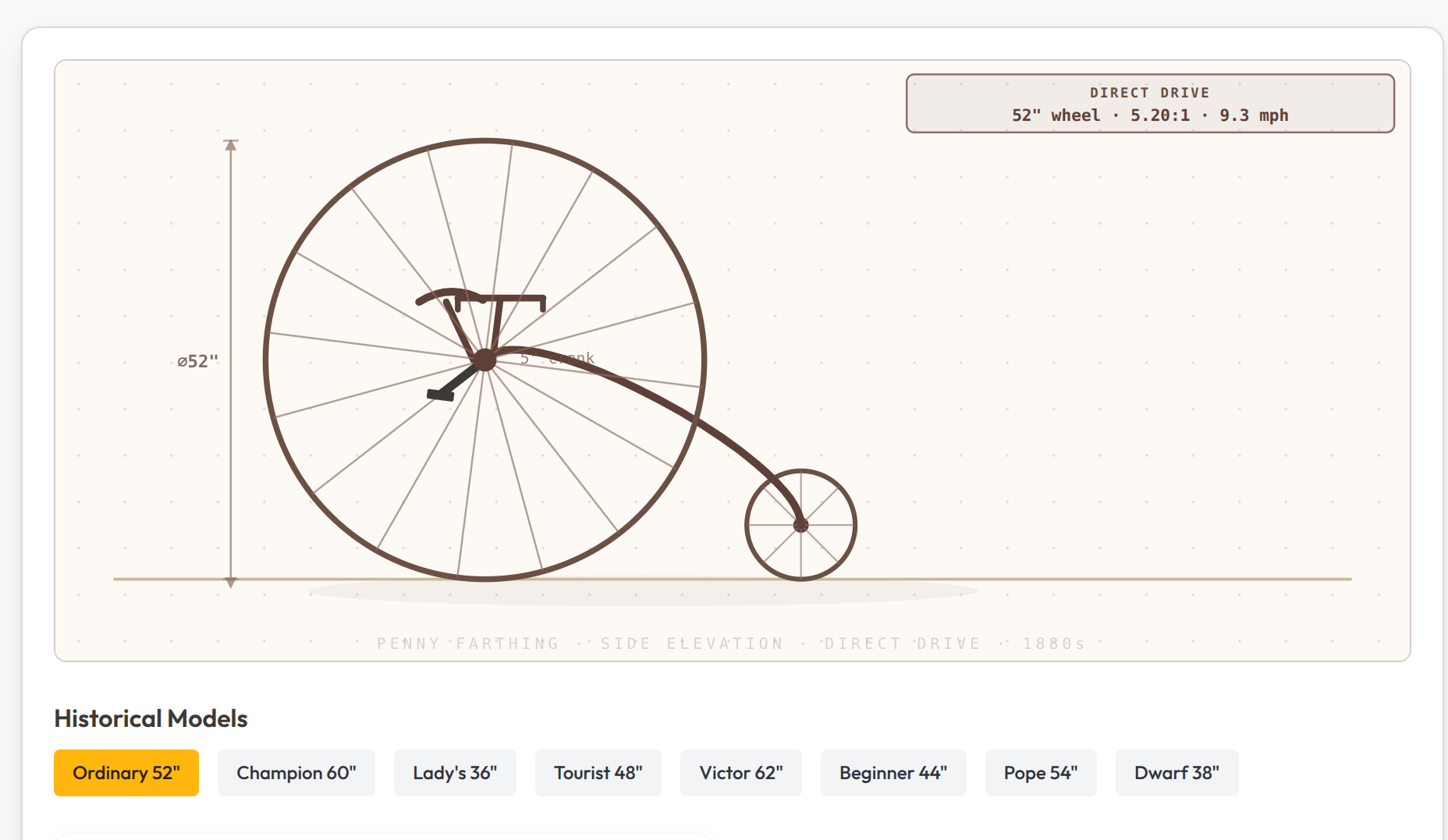 The High-Wheeler Gear Calculator at riatto.ovh models the direct-drive physics of an Ordinary precisely. Enter your wheel diameter, crank length, and cadence, and it returns the numbers every Victorian racing cyclist would have known by instinct.