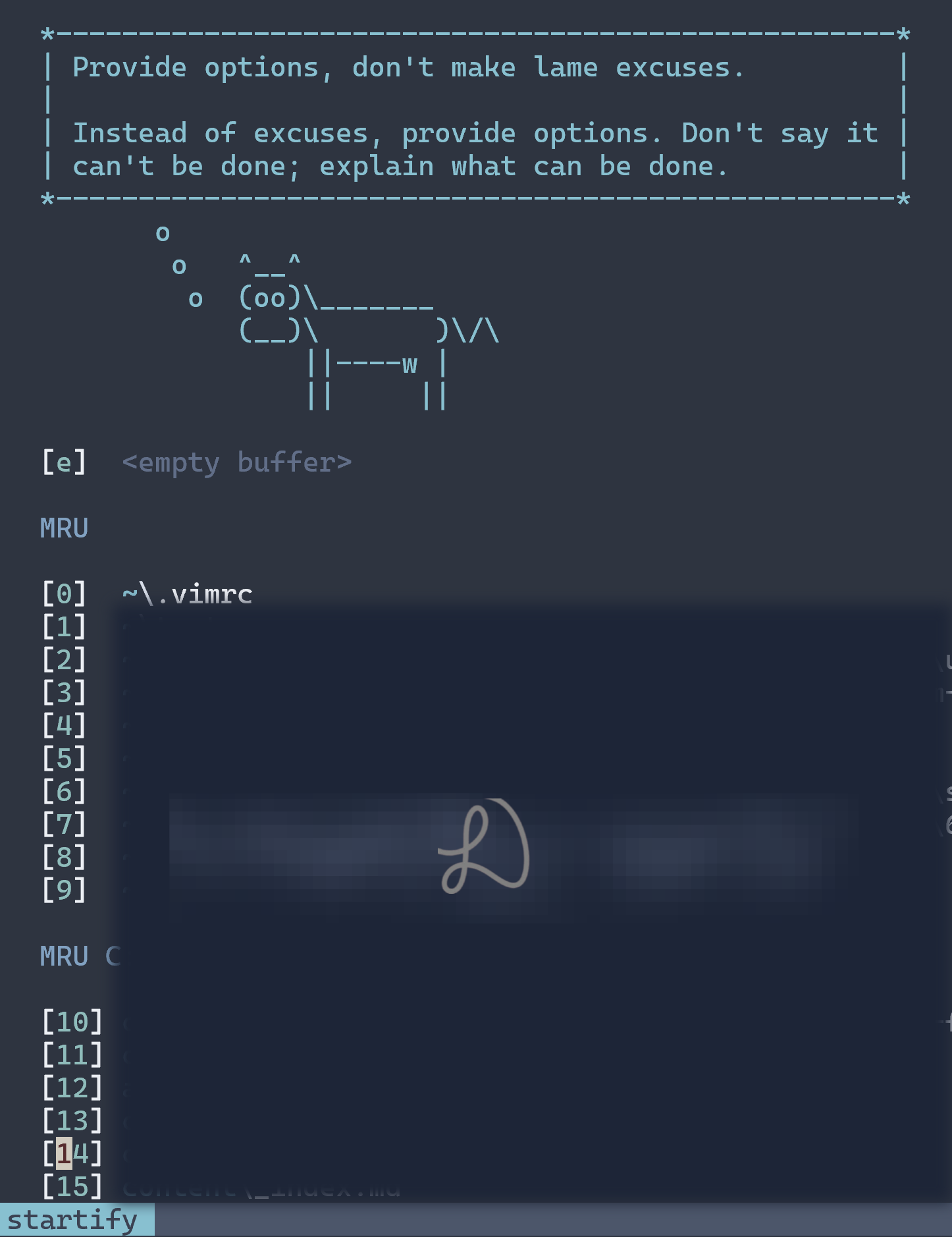 Startify is a start screen for vim and neo vim. Type vim without any filename to access it. It is convenient to see all recent files that can be opened by typing the number next to it ( the numbers above the alphabets, not the keypad). Equally or even more useful is the saving of sessions with :SSave session-name. And thereafter we can access that session from the start screen. Even file bookmarks too.