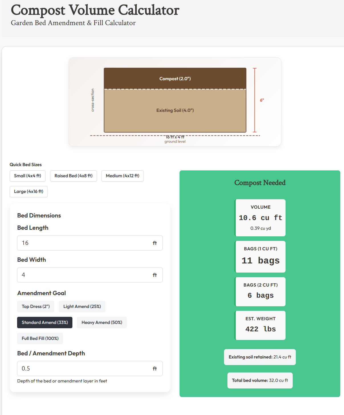 Enter your bed length, width, and desired depth of amendment, and it gives you the cubic volume to order or prepare. Particularly useful if you’re running a home compost system — it tells you whether your current pile will cover your beds or whether you need to supplement.