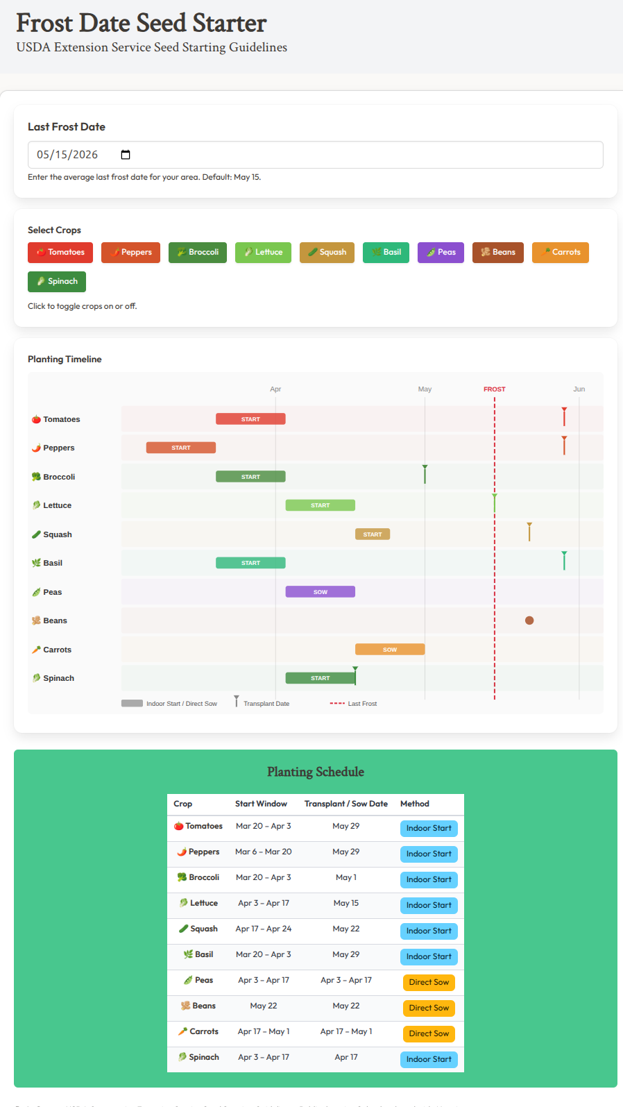 Enter your location and the tool calculates your seed-starting schedule — when to sow indoors, when to transplant, and when it’s safe to direct sow outside. This becomes your seasonal calendar that sits alongside the rotation plan. You’ll reference it every spring.